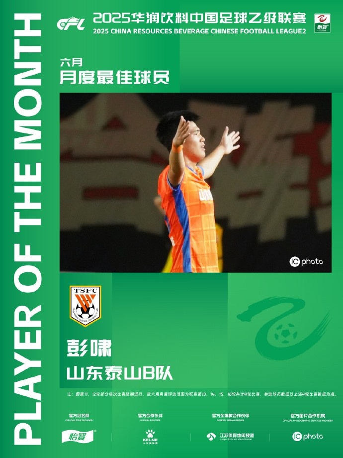 中乙联赛6月的赛事中,山东泰山B队取得了2胜2平的不败战绩,19岁的后卫彭啸打入4球。