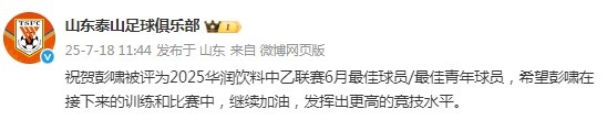 7月18日讯 在泰山B队球员彭啸包揽中乙联赛6月最佳球员和最佳青年球员奖项后,泰山俱乐部官博向其送上了祝贺。